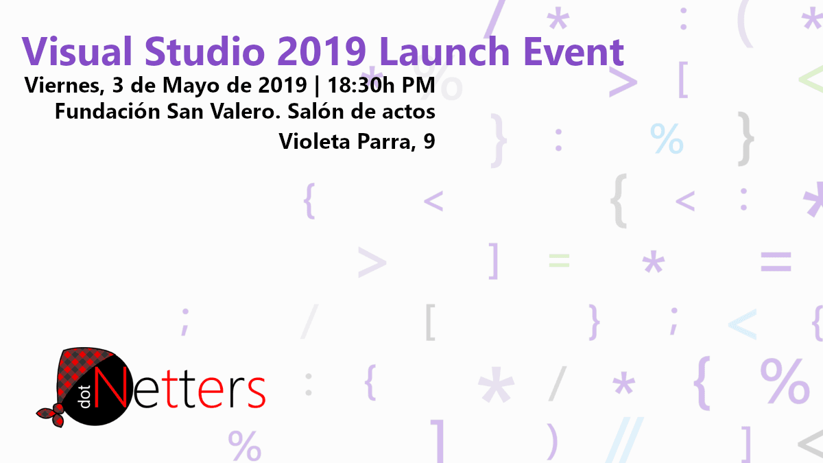 El 2 de Abril se presenta la nueva versión de Visual Studio: Visual Studio 2019 Habrá 5 charlas de unos 20 - 25 minutos sobre diferentes temas relacionados con el lanzamiento de Visual Studio 2019 Agenda: - Novedades en Visual Studio 2019 (Javier Vela) - Qué debes conocer de .Net Core 3.0