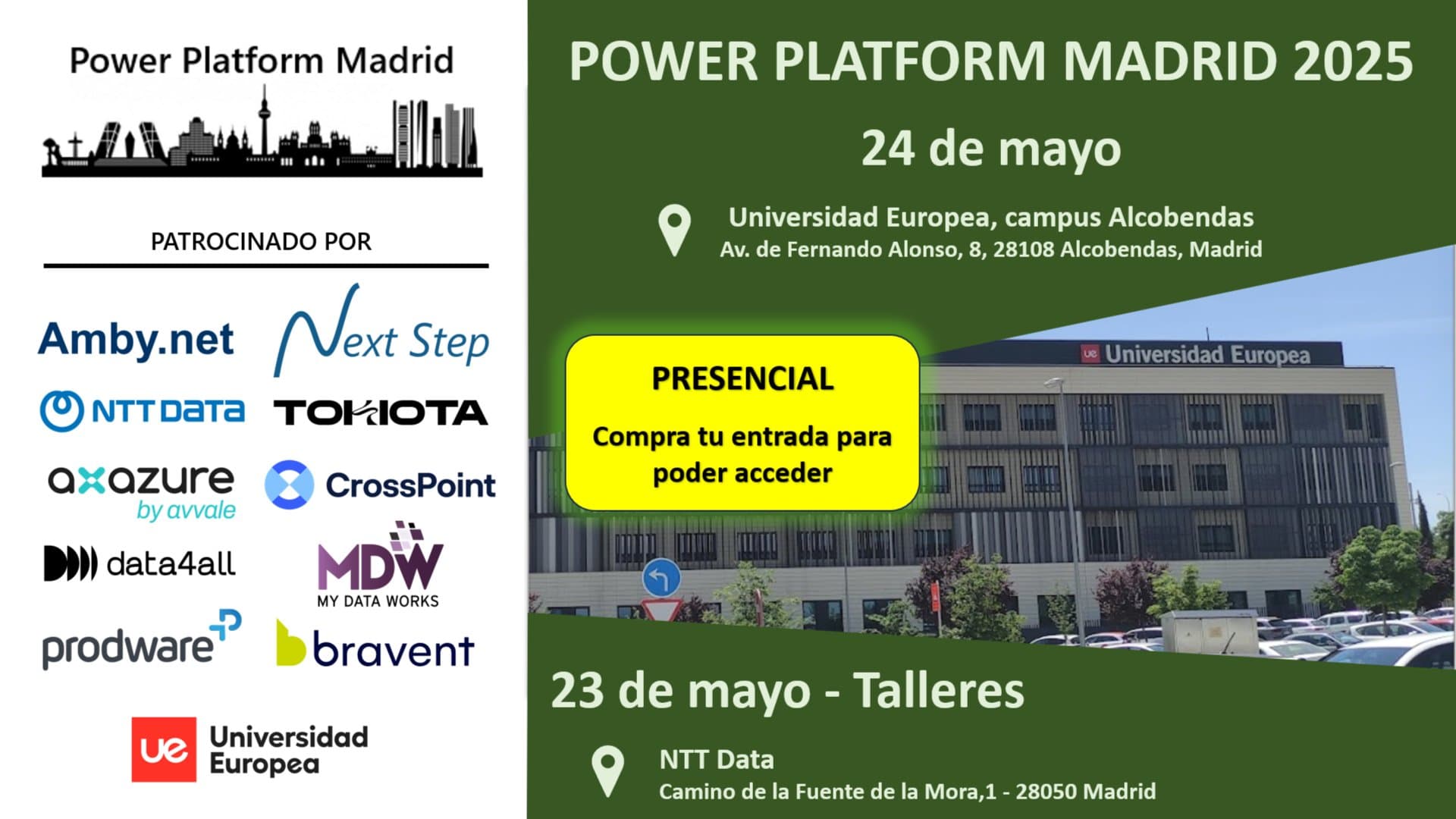En esta ocasión nos reuniremos en las instalaciones de NTT Data en Madrid Y el sábado 25 un montón de sesiones, en diversos tracks, donde se repasarán las últimas novedades y características de Power Platform, y, como no, se hablará y mucho de AI IMPORTANTE: Si quieres asistir recuerda que por motivos de aforo y control de asistencia, será necesario adquirir una entrada nominativa indicando nombre y DNI